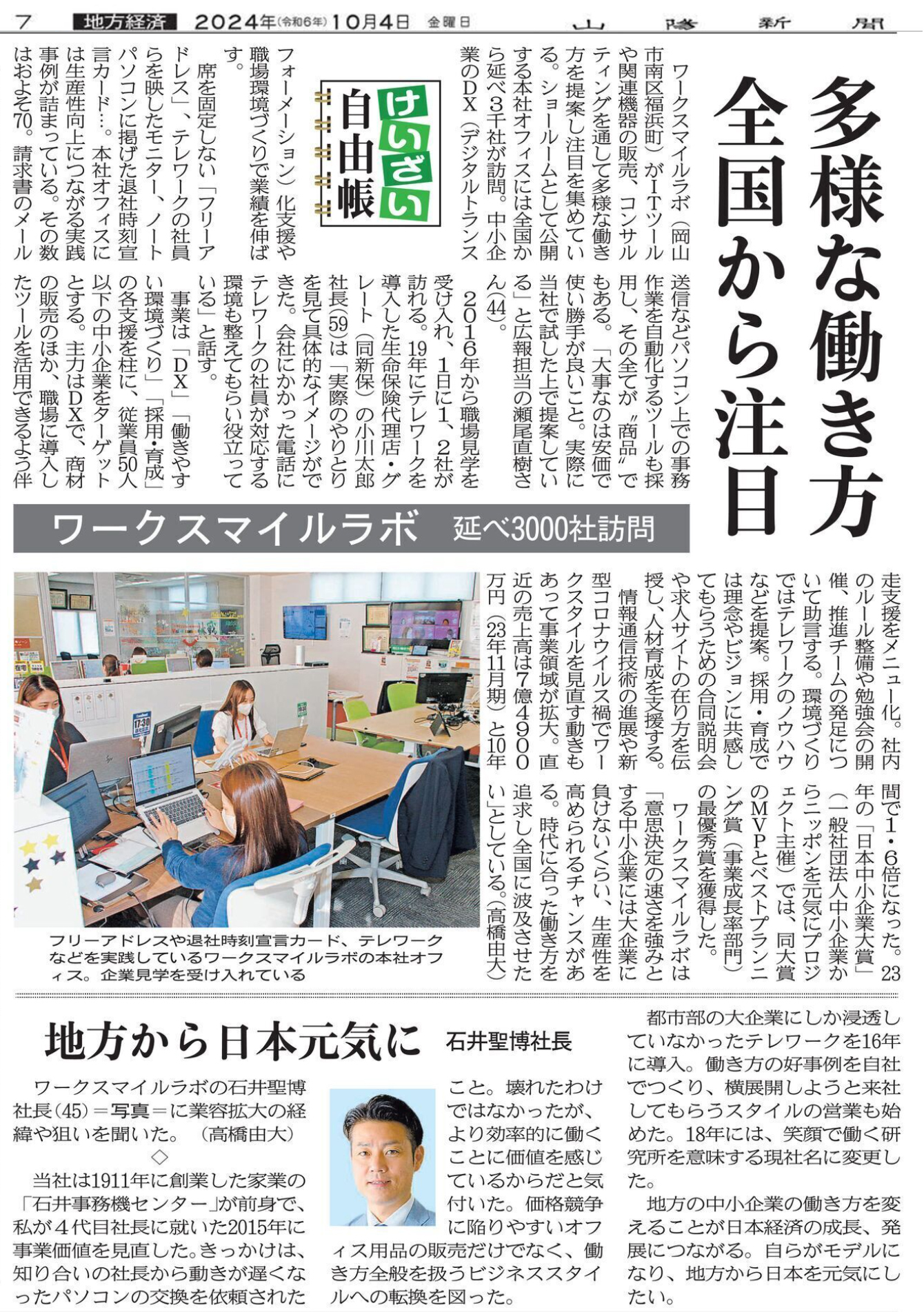 ワークスマイルラボ (岡山市南区福浜町)がITツールや関連機器の販売、コンサルティングを通して多様な働き方を提案し注目を集めている。ショールームとして公開する本社オフィスには全国から延べ3千社が訪問。中小企業のDX(デジタルトランスフォーメーション)化支援や職場環境づくりで業績を伸ばす。
