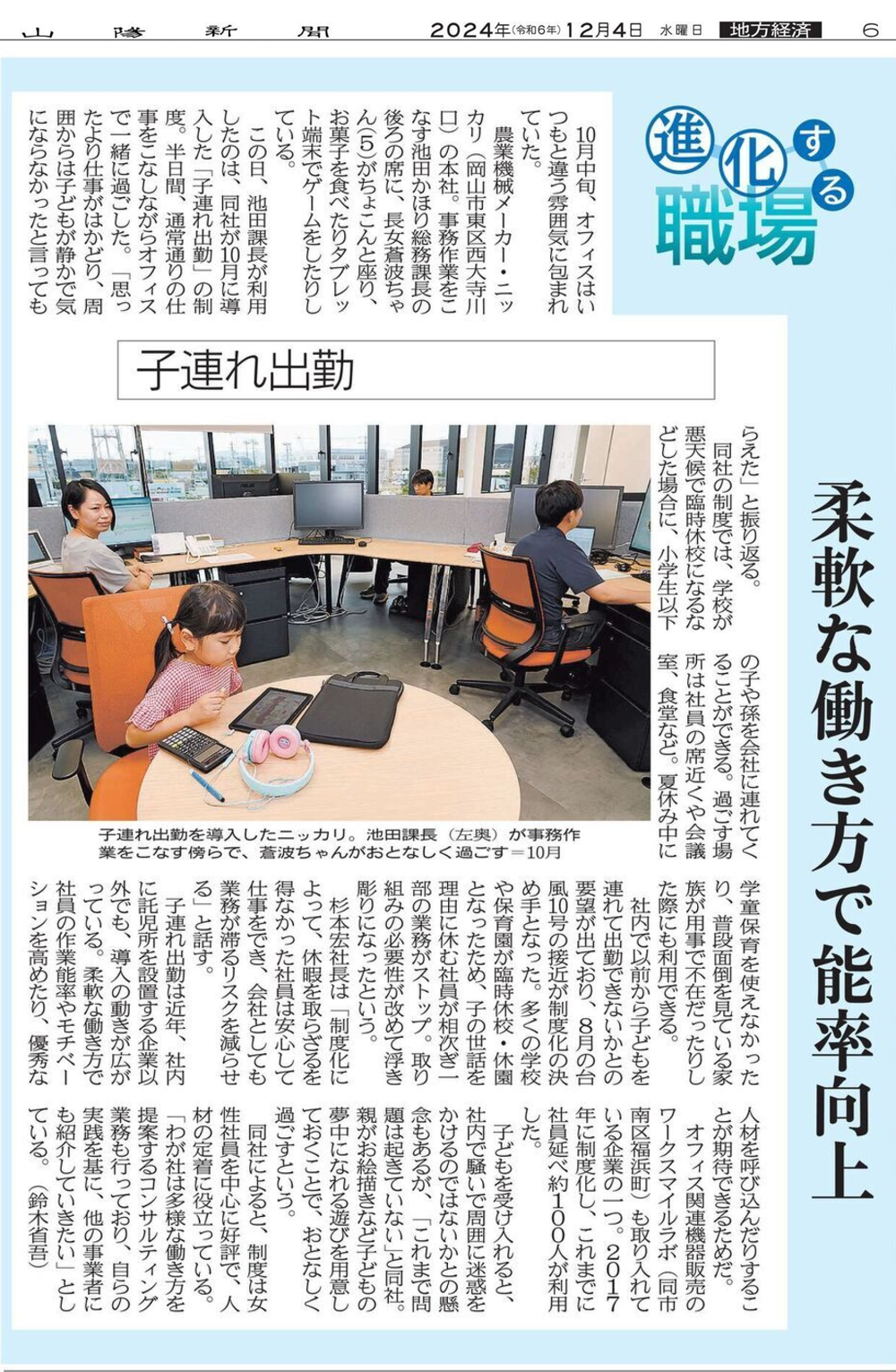 同社によると、制度は女性社員を中心に好評で、人材の定着に役立っている。「わが社は多様な働き方を提案するコンサルティング業務も行っており、自らの実践を基に、他の事業者にも紹介していきたい」としている。