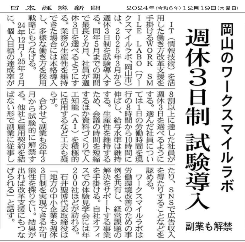 IT(情報技術)を活用した働き方改革支援を手掛けるWORK SMILE LABO(ワークスマイルラボ、岡山市)は、2025年3月から週休3日制を試験導入する。同年5月までの期間で最長2カ月、社員が週休3日を選べるようにする。業務の生産性を維持できた場合には本格導入し、多様な働き方を採用戦略にもつなげる。