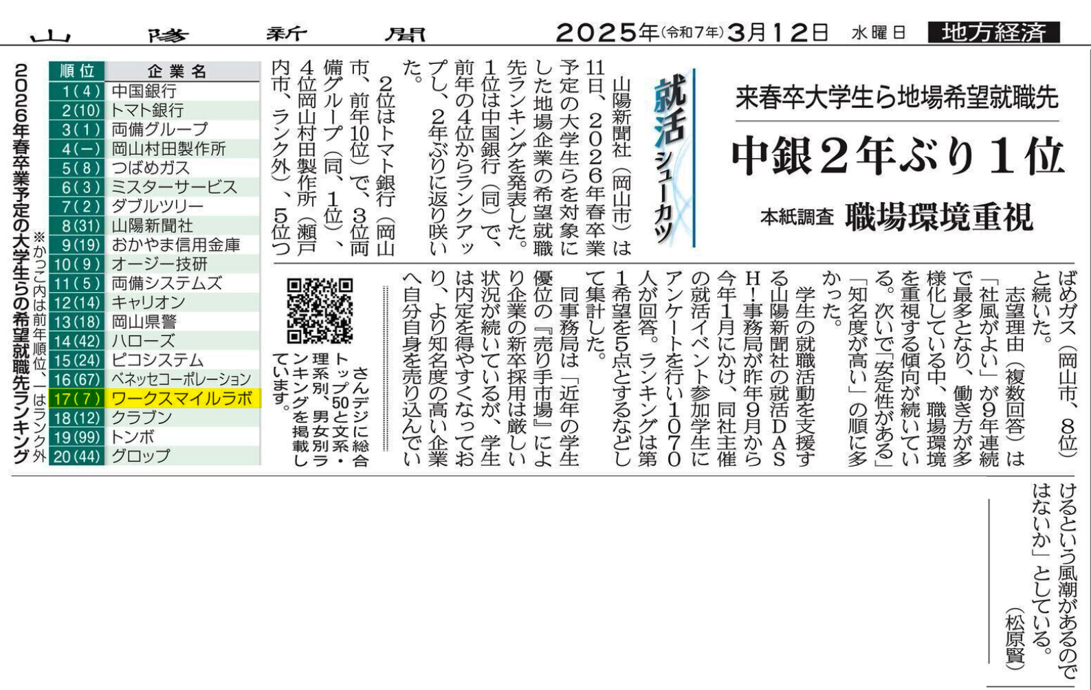山陽新聞社(岡山市)は11日、2026年春卒業予定の大学生らを対象にした地場企業の希望就職先ランキングを発表した。1位は中国銀行(同)で、前年の4位からランクアップし、2年ぶりに返り咲いた。