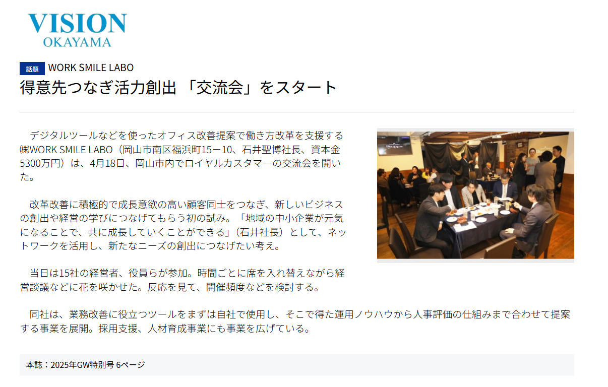 デジタルツールなどを使ったオフィス改善提案で働き方改革を支援する(株)WORK SMILE LABO(岡山市南区福浜町15-10、石井聖博社長、資本金5300万円)は、4月18日、岡山市内でロイヤルカスタマーの交流会を開いた。