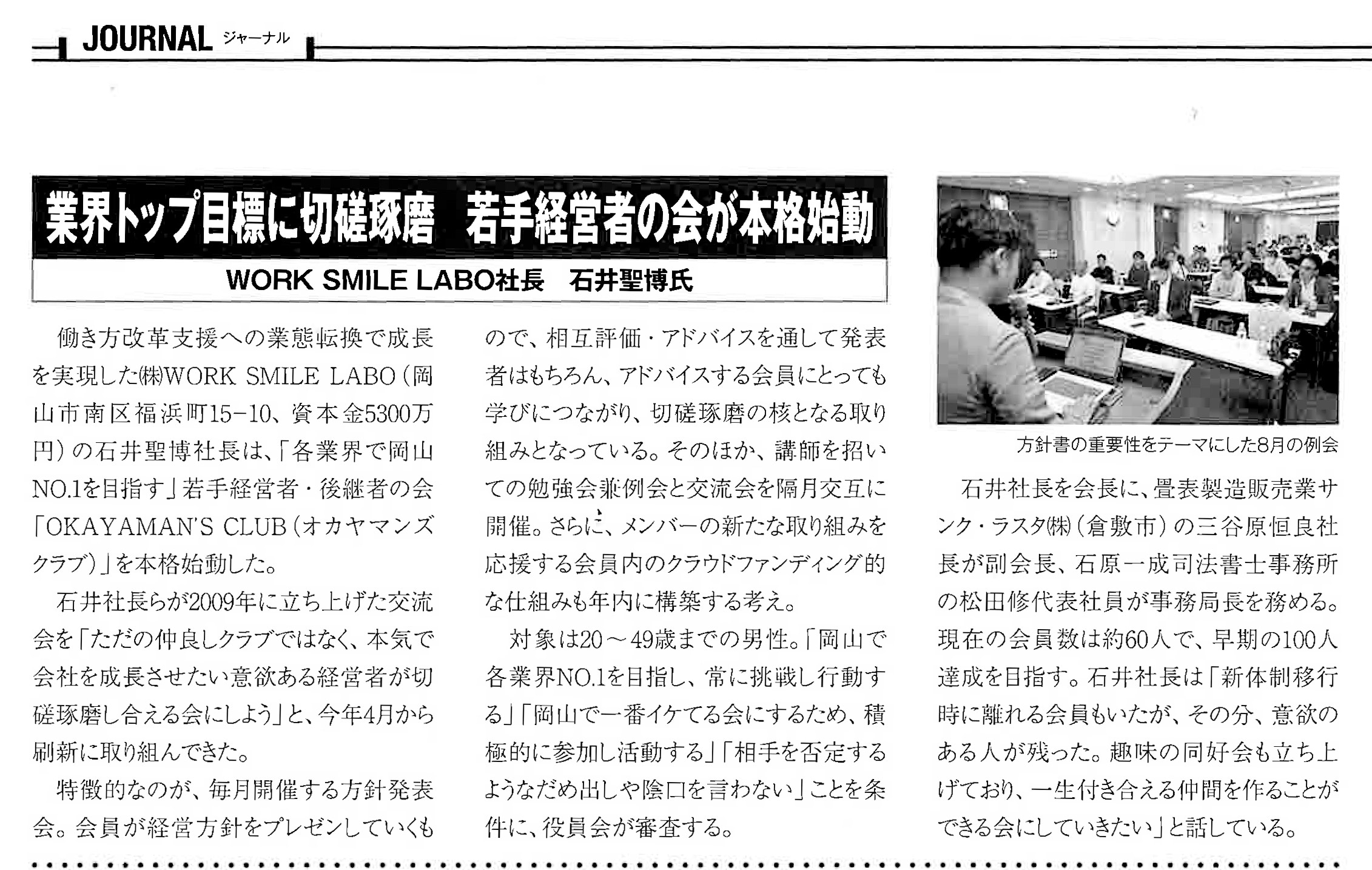 働き方改革支援への業態転換で成長を実現した(株)WORK SMILE LABOの石井聖博社長は、「各業界で岡山No.1を目指す」若手経営者・後継者の会「OKAYAMAN’S CLUB(オカヤマンズクラブ)」を本格始動した。
